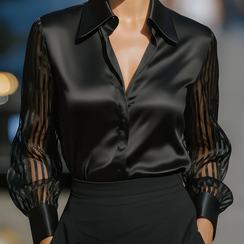 Crafted from smooth, luminous satin-finish fabric, this blouse features a timeless lapel collar that frames the neckline elegantly. The long sleeves are designed with a subtle sheer texture, adding a touch of refined allure while maintaining professionalism. With a relaxed yet tailored fit and a full button-down front, this piece drapes beautifully and moves with effortless grace.